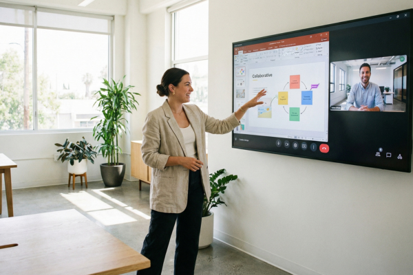 A resposta está nos ambientes corporativos e educacionais conectados. Salas de reunião equipadas com sistemas de colaboração, displays profissionais e plataformas integradas que tornam a experiência igualmente boa para quem está presencialmente e para quem está remoto.